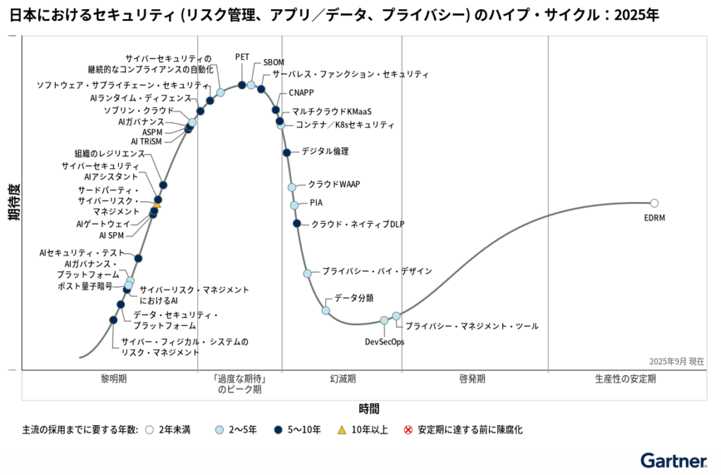 出典:Gartner、2025年の日本におけるセキュリティ (リスク管理、アプリ/データ、プライバシー) のハイプ・サイクルを発表