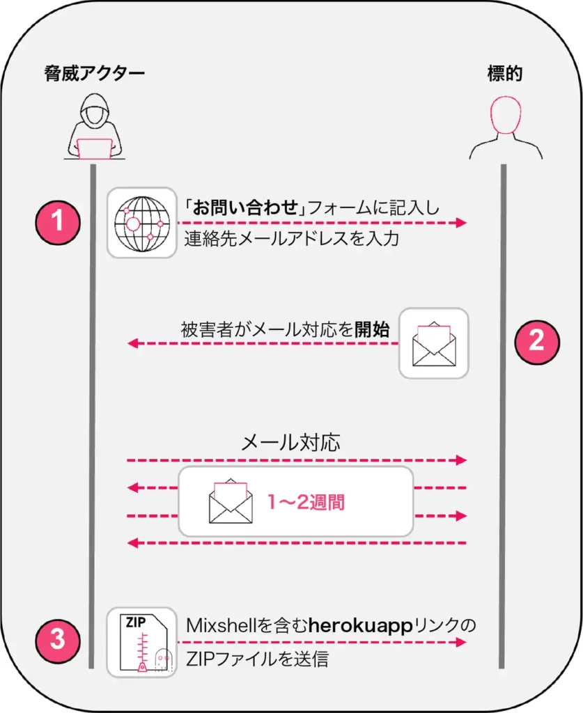 ZipLineは、一般的な「攻撃者→被害者」送信の流れを取らず、企業サイトの問い合わせフォームから先に連絡する。これにより被害者側が最初のメールを発信する構図となり、評判分析ベースのフィルター回避につながる。以後は正統な商談のように見える往復が続き、信頼感が醸成される点が厄介である。