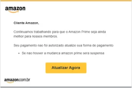 「お支払い方法が承認されません」と告げるブラジル・ポルトガル語のメールを送付し、「Atualizar Agora(今すぐ更新)」ボタンで偽のAmazonログインサイトへ誘導する。狙いはAmazonアカウントの認証情報である。リリースには、メール画面と偽ログインサイトが示されている。