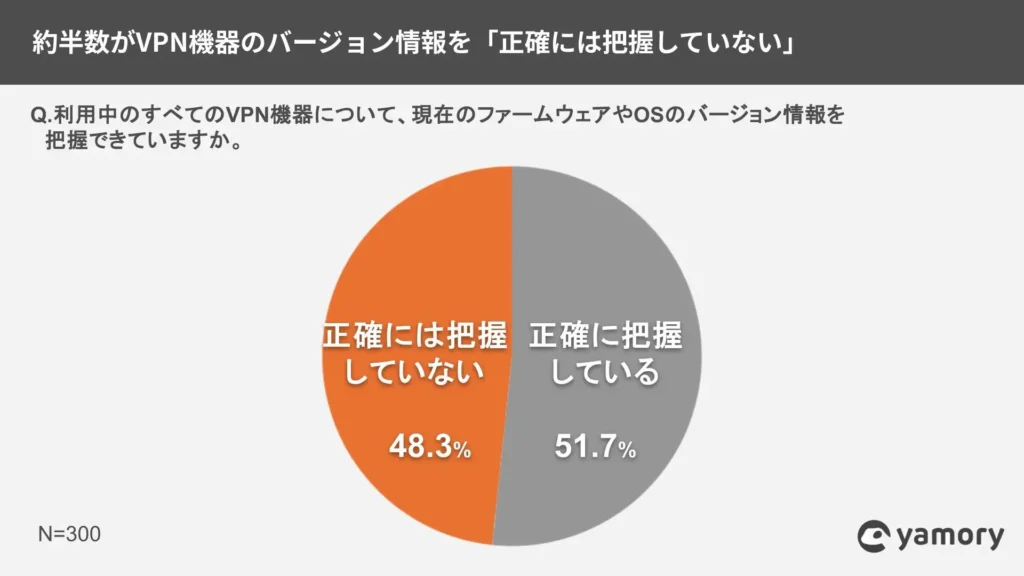 利用中のVPN機器のファームウェア/OSバージョンについて、「正確には把握できていない」(48.3%)と回答した。資産情報(インベントリ)の管理遅れは、脆弱性発生時の迅速な対象機器特定を阻害する要因となる。