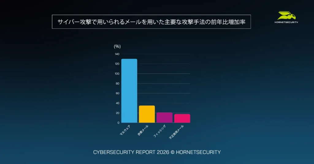 レポートは、電子メールが主要な侵入経路であるとし、前年との比較で「マルウェアを含むメール」131%増、「詐欺メール」34.7%増、「フィッシング」21%増と整理している。攻撃が量・質ともに拡大している現状を明確に示すものである。