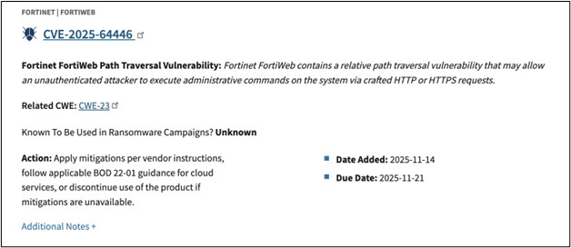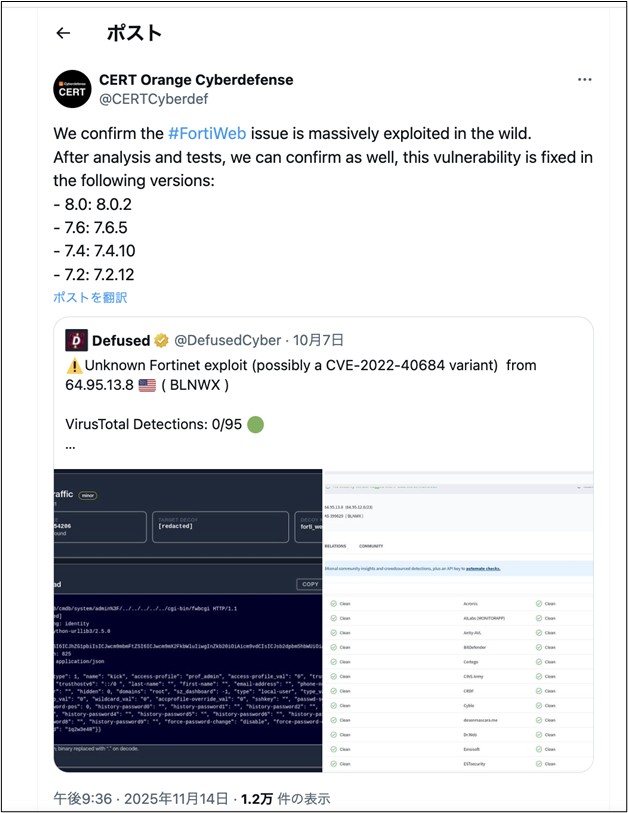 3. Fortiwebにパストラバーサルの脆弱性(CVE-2025-64446)。既に多くのエクスプロイトコードが観測されている模様