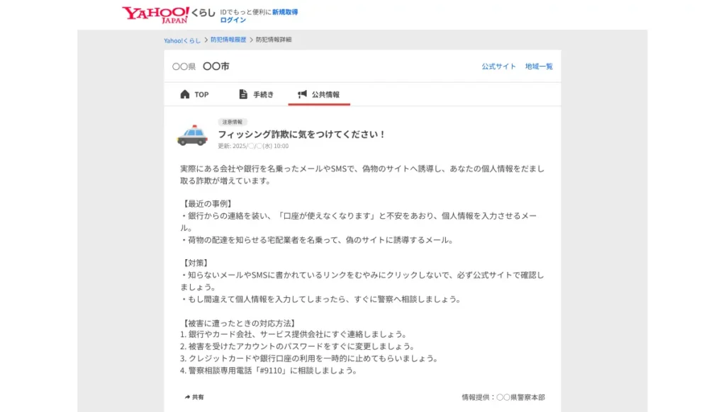 また、配信された情報は「Yahoo!くらし」のウェブページ(PC版・スマートフォンブラウザー版)の「公共情報」でも確認できる。