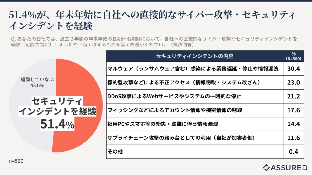 株式会社アシュアードは、従業員数1,000名以上の大手企業に所属する情報システム・セキュリティ部門の担当者500名を対象に、年末年始休暇期間のセキュリティ対策実態調査を実施した。その結果、過去3年間で55.4%の企業が年末年始に何らかのセキュリティ被害を経験しており、約7割が休暇中の自社のセキュリティ体制に不安を感じている実態が明らかになった。一方で、取引先との緊急連絡体制を通常時より強化している企業は19.2%にとどまり、サプライチェーン全体のリスク管理には課題が残っているとしている。