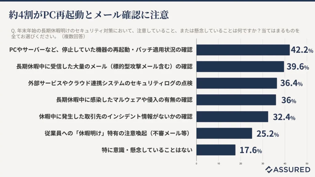 休暇明けの対策として、最も注意している・懸念している点として挙げられたのは、「PCやサーバーなど、停止していた機器の再起動・パッチ適用状況の確認」で42.2%である。次いで、「長期休暇中に受信した大量のメール(標的型攻撃メール含む)の確認」が39.6%となっている。