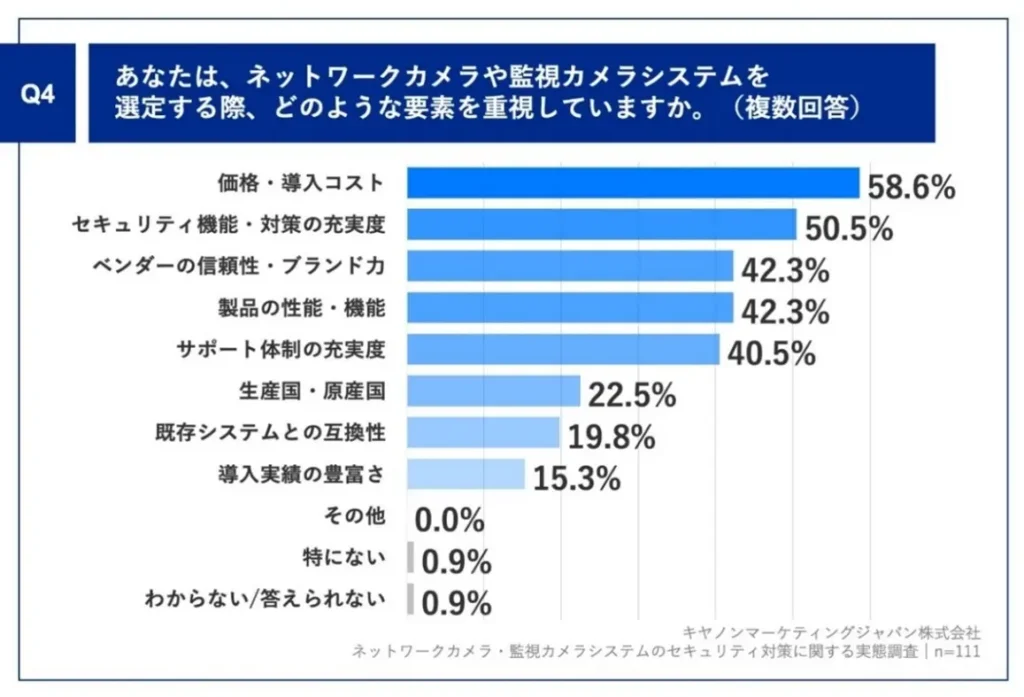ネットワークカメラや監視カメラシステムを選定する際に重視する要素(複数回答)については、「価格・導入コスト」が58.6%で最も多く、「セキュリティ機能・対策の充実度」が50.5%、「ベンダーの信頼性・ブランド力」と「製品の性能・機能」がそれぞれ42.3%となった。