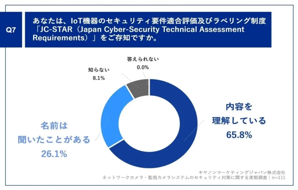 IoT機器のセキュリティ要件適合評価およびラベリング制度「JC-STAR」についての認知度を尋ねたところ、「内容を理解している」が65.8%、「名前は聞いたことがある」が26.1%となり、約7割が内容を理解していると回答した。