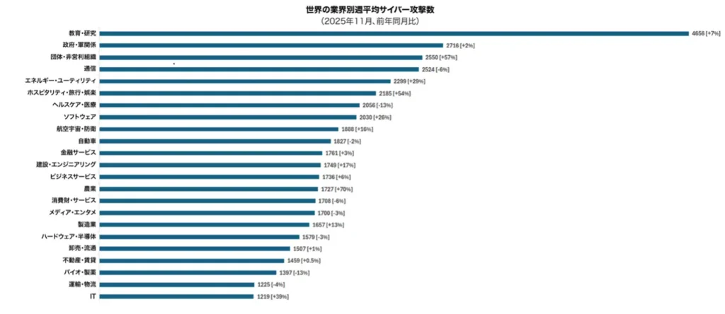 最も大きな打撃を受けている業界は教育・研究分野であり、組織あたり週平均4,656件の攻撃(前年比7ポイント増)を受けている。次いで政府・軍関係が2,716件(前年比2ポイント増)、団体・非営利組織が2,550件(前年比57ポイント増)となっている。