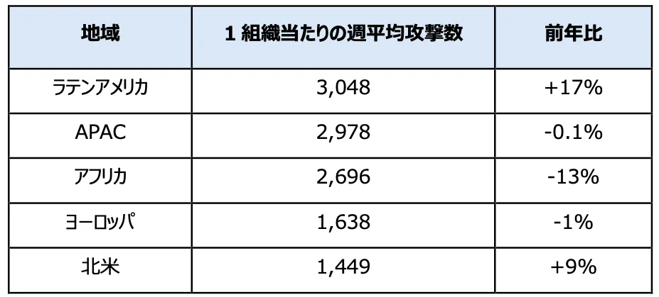 地域別では、ラテンアメリカが週平均3,048件(前年比17ポイント増)で最多となり、アジア太平洋地域(APAC)は2,978件(前年比0.1%減)、アフリカは2,696件(前年比13ポイント減)である。ヨーロッパは前年比1ポイント減、北米は前年比9ポイント増となり、高度で金銭目的の脅威グループの主要標的となっている。