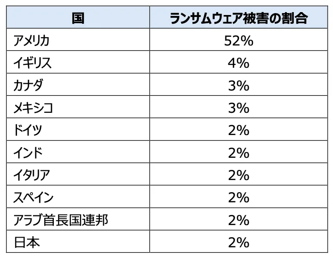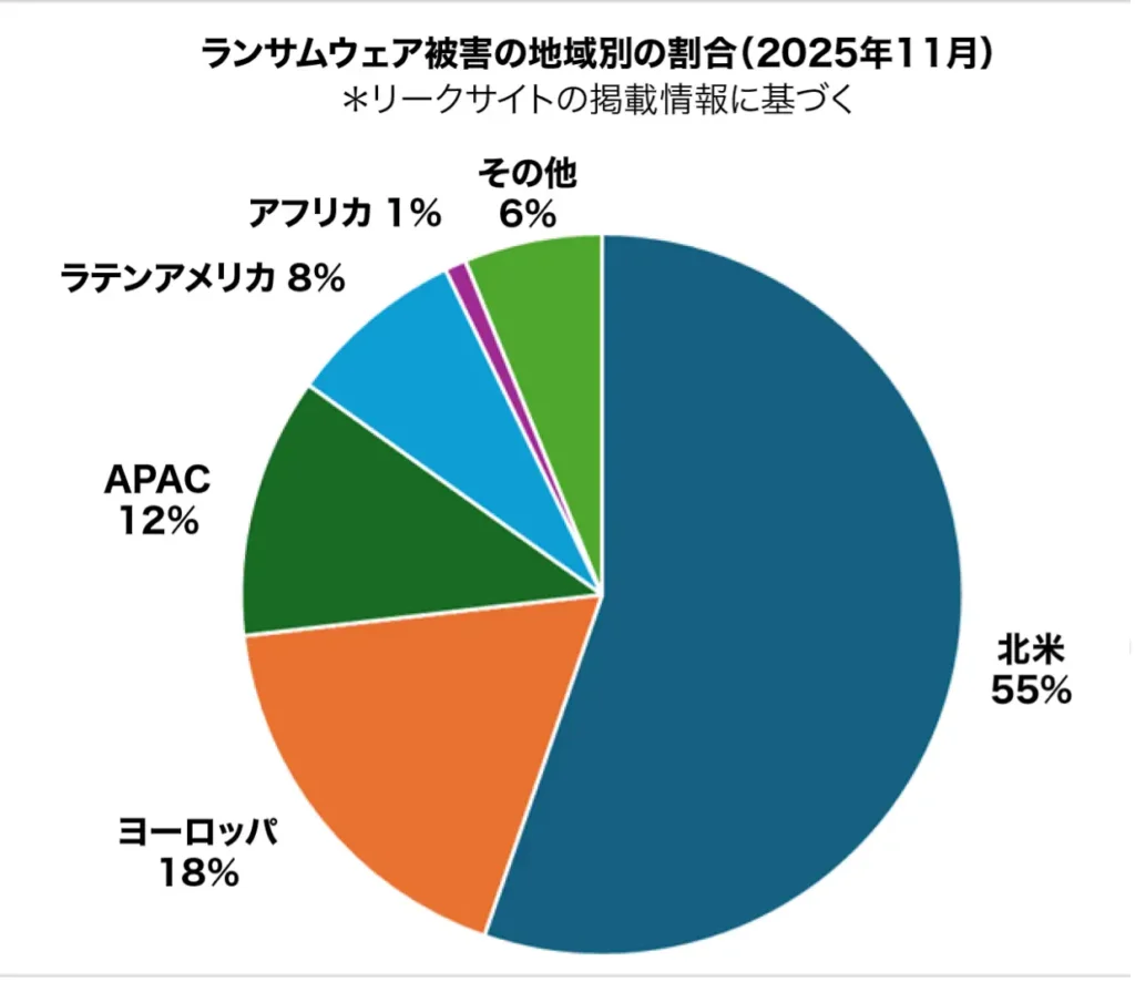 2025年11月には727件のランサムウェア被害が報告され、前年同月比22%増となった。北米が公表事案の55%を占め、ヨーロッパが18%で続く。国別では、アメリカが被害の52%、イギリスが4%、カナダが3%である。