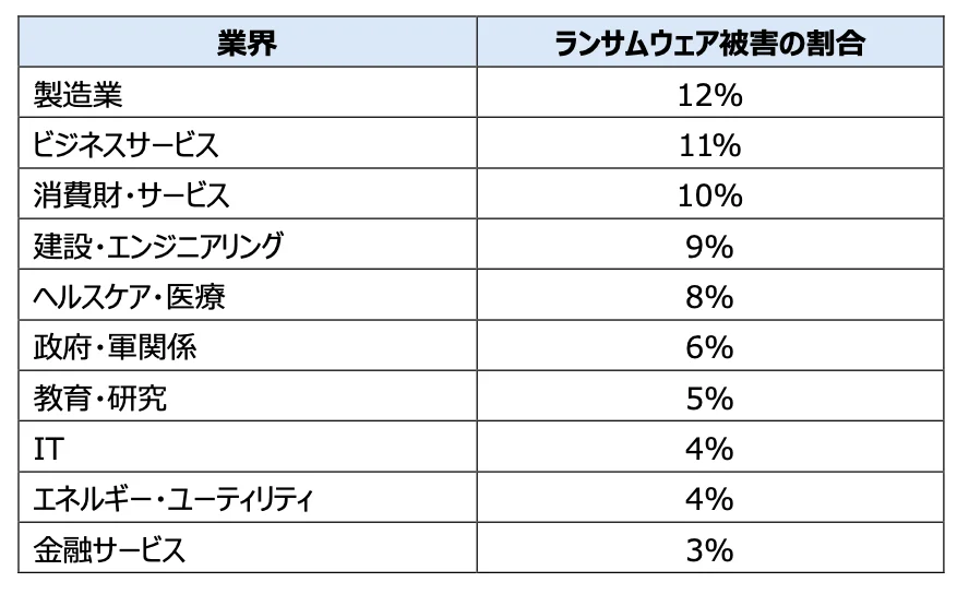 業界別では、製造業が被害の12%で最も大きく、ビジネスサービスが11%、消費財・サービスが10%となっている。