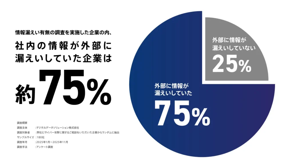 デジタルデータソリューション株式会社(以下デジタルデータソリューション)は、2025年にサイバー攻撃の被害を受けた企業180社を対象に「2025年サイバー攻撃による情報漏えいの被害実態調査」を実施した。フォレンジック調査で情報漏えいの可能性が示唆されても、約48%の企業が追加調査を行っておらず、一方で調査を実施した企業の約75%で実際の漏えいが確認されるなど、インシデント対応と情報把握の間に大きなギャップがある実態が明らかになった。