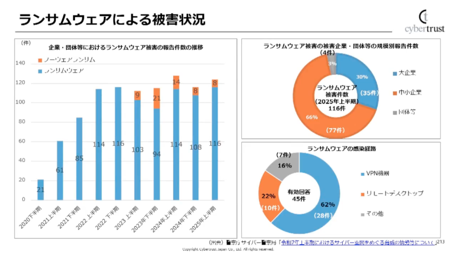 警察庁 サイバー警察局が公表している被害届出の集計によると、ランサムウェア被害の多くは中小企業に集中しています。その背景として田上氏が挙げたのが、侵入経路の固定化です。