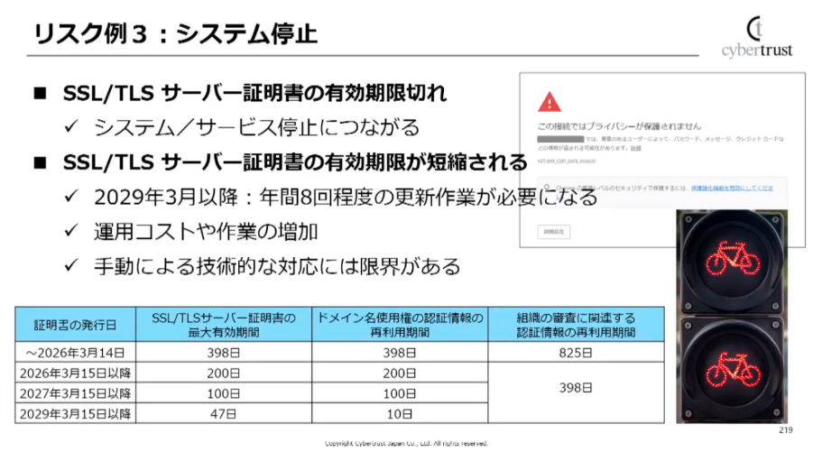 さらに今後は、業界全体の動きとして証明書の有効期間が大幅に短縮されます。2029年3月以降は最大47日となり、年間で約8回の更新が必要になります。人手による管理は現実的ではなく、自動化が前提条件になる新たなリスクだと指摘されました。