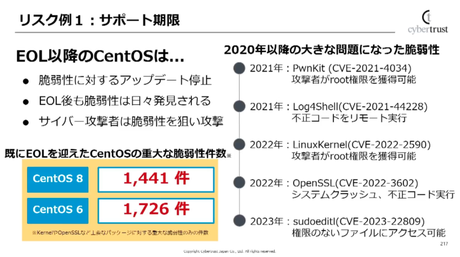 具体例として紹介されたのが、CentOSのEOL問題です。CentOS 6や7、8はすでにサポート終了していますが、現在も現場で使われ続けているケースが多く見られます。