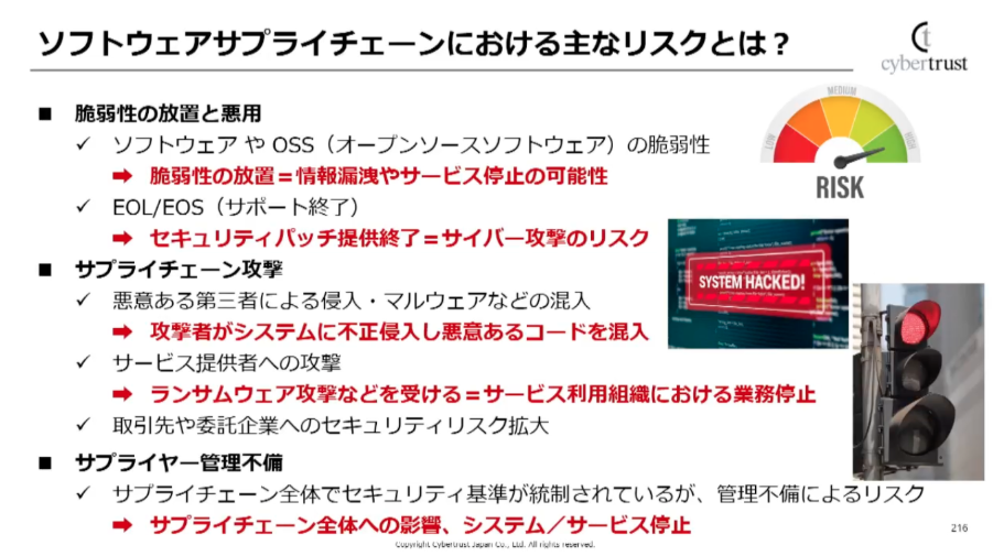 ランサムウェア被害の拡大、ソフトウェアサプライチェーンの複雑化、EOL(サポート終了)ソフトウェアの放置など、企業を取り巻くリスクは年々増加しています。本セッションでは、それらを個別の問題としてではなく、「ガバナンスと管理の問題」として捉える重要性が強調されました。