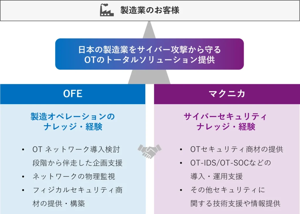 本協業により、製造現場の実情に即した製造現場の実情に即したセキュリティ対策を支援するとしている。OFEは現場主義に基づくネットワーク構築力や、情報システム部門と製造部門の双方に寄り添った企画支援を強みとし、マクニカはサイバーセキュリティ分野における専門性やOT脅威インテリジェンス、インシデント対応支援の実績を生かす。