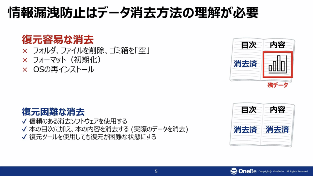 セッションの前半で強調されたのは、日常的に行われがちな「削除」「ゴミ箱を空にする」「フォーマット」「OS再インストール」は、実は“復元が容易な消去”に分類される点です。見た目上は消えたように見えても、内部にデータが残っているため、復元ツールを使えば内容が取り出せる可能性があります。