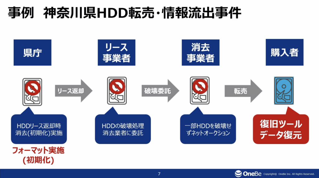 総務省のガイドライン改定の背景として紹介されたのが、2019年に話題となった神奈川県庁のハードディスク転売による情報流出事件です。県庁側は返却前にフォーマットを実施していましたが、破壊委託先の一部ディスクが破壊されずオークションに流れ、購入者が復元ツールでデータを確認した結果、県庁関連データが見つかった――という流れです。