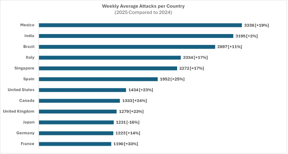 2025年、日本は1組織当たり週平均1,231件の攻撃を受け、2024年比で16%減となった。攻撃件数では上位12カ国中10位に位置している。