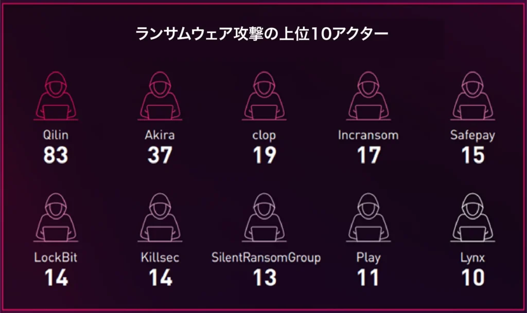 ランサムウェア脅威活動はごく少数の攻撃者グループに集中しており、Qilin(83件 / 18.4%)が最多で、Akira(37件 / 8.2%)、Clop(19件 / 4.2%)がこれに続く。