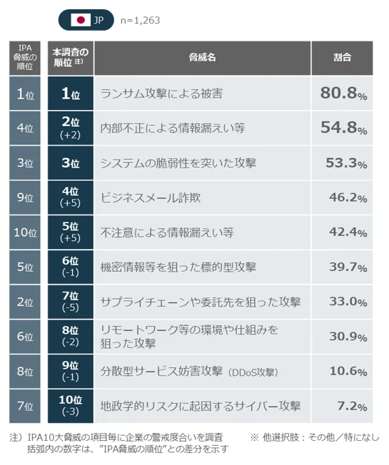 IPA「情報セキュリティ10大脅威 2025」を基に、日本企業が警戒している脅威を尋ねた結果、1位は「ランサムウェアによる被害」(80.8%)であった。