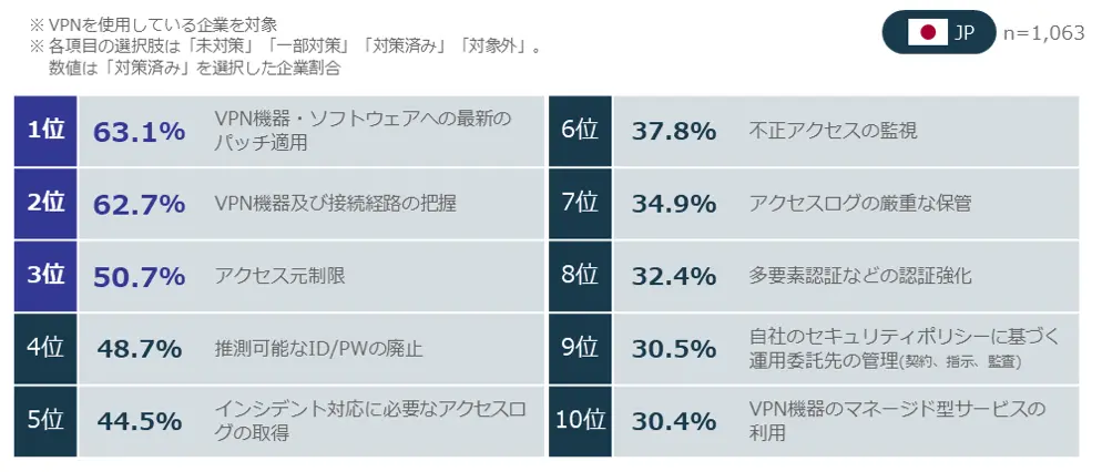 VPNの使用率は84.2%と高水準を維持している。一方、「最新のパッチ適用」を完了している企業は63.1%にとどまり、約4割が未完了の状態にある。