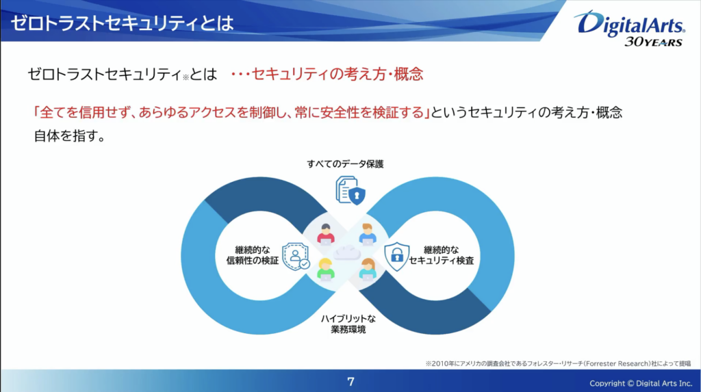中山氏は、働き方の変化とクラウド利用の拡大によって「社内ネットワークの内側を守ればよい」という境界防御が限界を迎えたと整理した。従業員や端末、業務システムは社内外に分散し、情報資産へアクセスする経路も多様化している。こうした環境では「社内だから安全」という前提が成り立たず、すべてのアクセスを検証し続けるゼロトラストの考え方が重要になる。