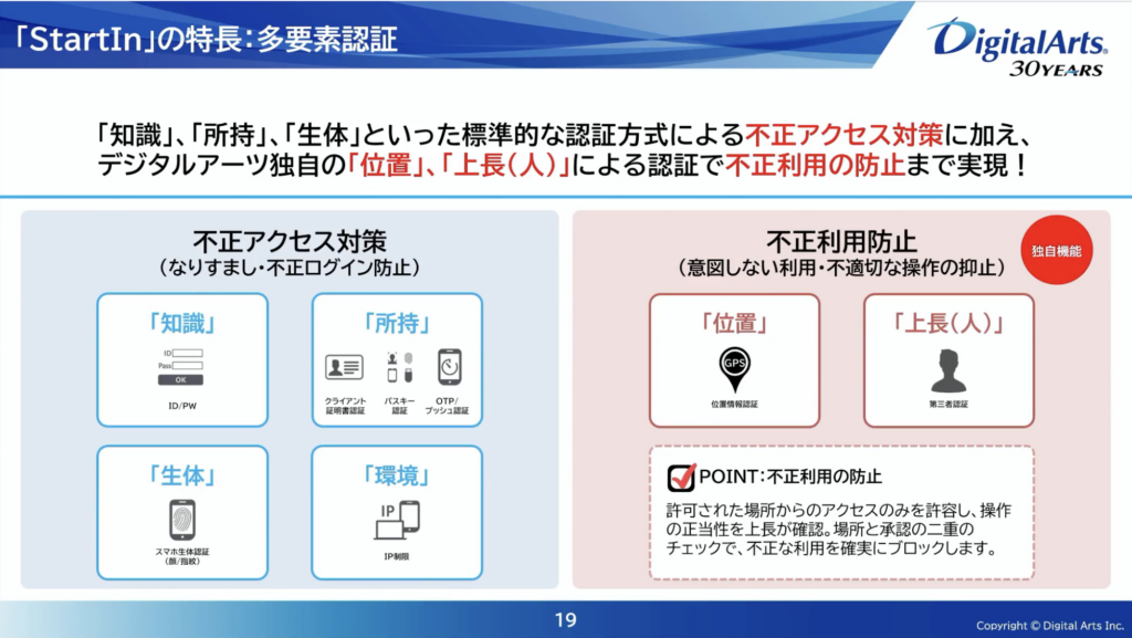 デジタルアーツのIDaaS「StartIn」は、IDaaSの基本機能(SSO、MFA、ID管理、ログ)を備えつつ、特に多要素認証の設計自由度を強みとして紹介された。狙いは、外部攻撃の遮断だけでなく、内部不正・不適切操作の抑止までを含めて“ID起点で統制する”ことにある。