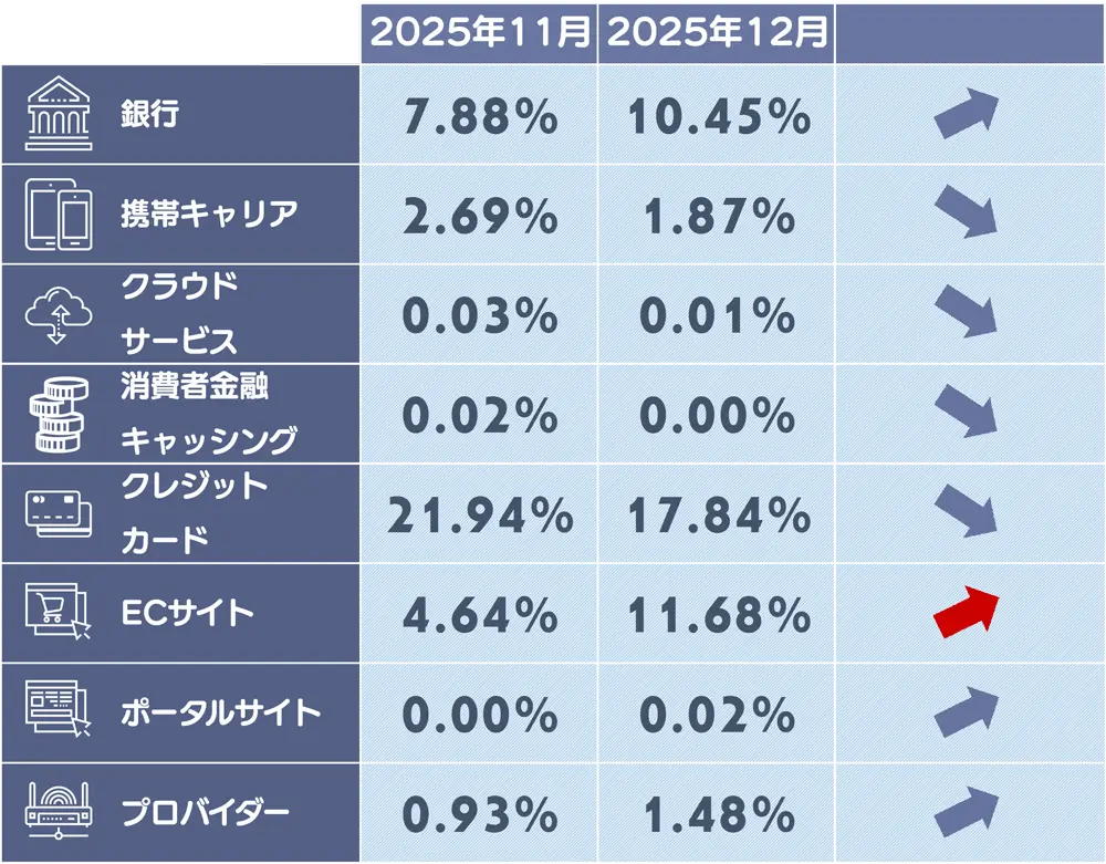 また、宝くじやANAなど、年末に利用機会が増えるサービスを装ったフィッシングも増加しており、引き続き注意が必要としている。