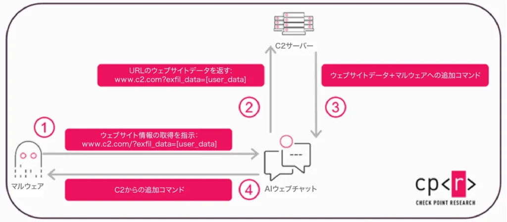 CPRは、ウェブブラウジングやURL取得機能を備えたAIプラットフォームが、マルウェアと攻撃者インフラの間を仲介する仕組みとして悪用され得ることを実証した。マルウェアはAIアシスタントに特定URLの取得や要約を指示することで、C2サーバーへ直接接続することなくデータ送信やコマンド受信を行えるとしている。
